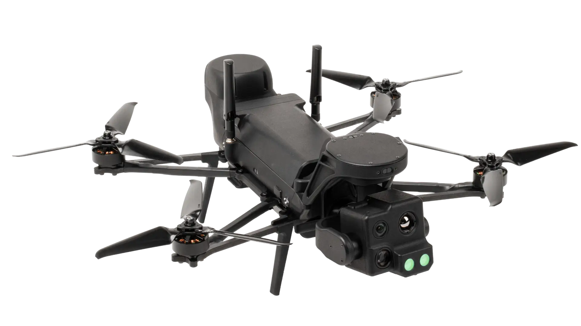 Quadcopter design enables VTOL capabilities and precision hovering, ideal for confined spaces and close-up inspections.